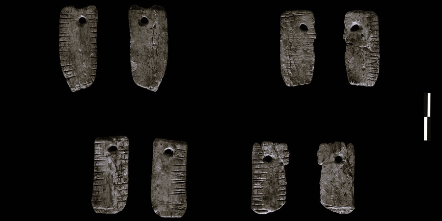 Un colgante de unos 30.000 años, encontrado en Gorge d’Enfer (Francia), presenta muescas en paralelo en sus bordes. Estas se interrumpen por la rotura de la pieza, tanto en la cabeza de colgadura como en la parte inferior, pero parece presentar unas 60 incisiones.