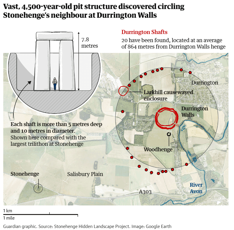 Se descubrió un círculo de pozos profundos cerca del sitio del patrimonio mundial de Stonehenge, para asombro de los arqueólogos, quienes lo describieron como la estructura prehistórica más grande jamás encontrada en Gran Bretaña.