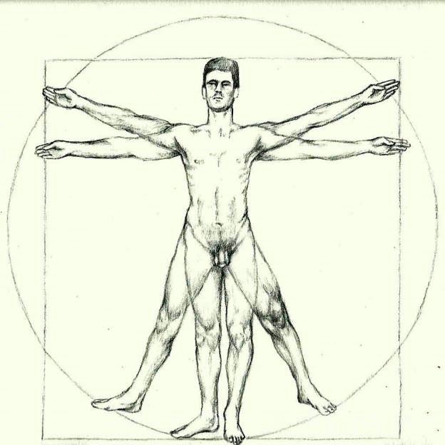 Si abres las piernas tanto como para disminuir tu altura 1/14 y extiendes y levantas los brazos hasta que tus dedos medios toquen el nivel de la parte superior de tu cabeza, debes saber que el centro de las extremidades extendidas estará en el ombligo y el espacio entre las piernas será un triángulo equilátero. La longitud de los brazos extendidos de un hombre es igual a su altura.