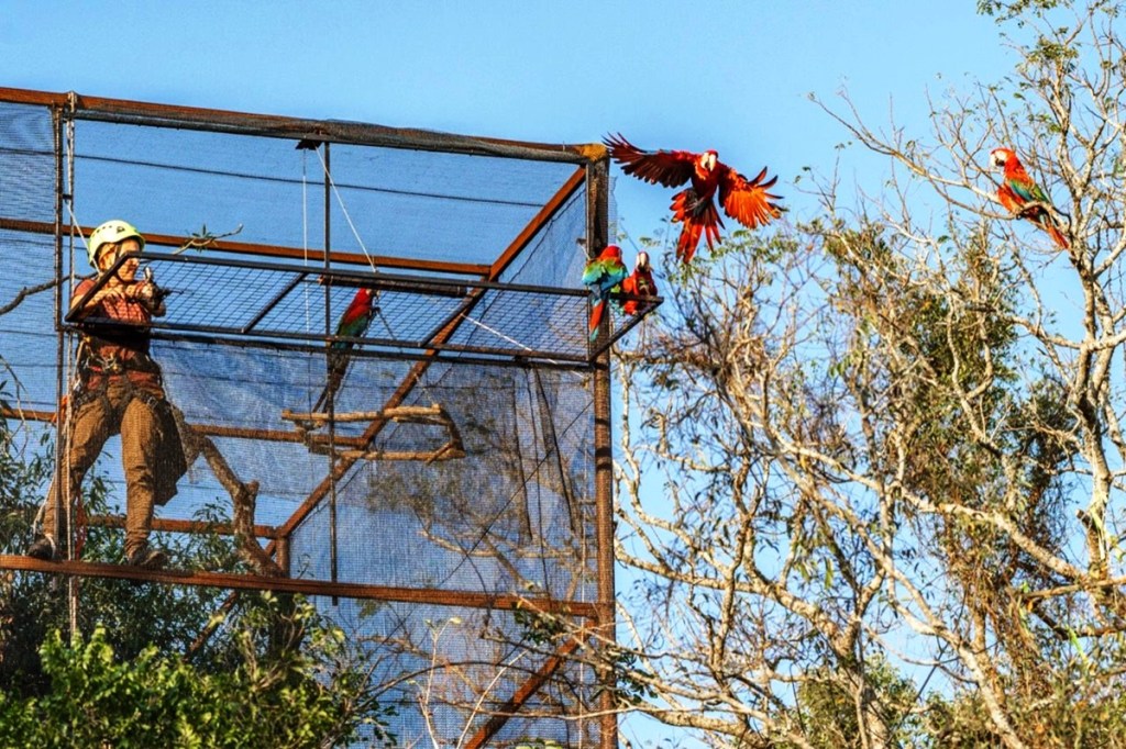 Esa preparación consiste en «enseñarles a aterrizar, a manejarse en su ambiente natural, motivarlos activamente a ejercitar el vuelo continuado para, luego, alcanzar mayores distancias», explicó la coordinadora del Proyecto de Reintroducción de Guacamayo Rojo de Rewilding Argentina, Marianela Masat.