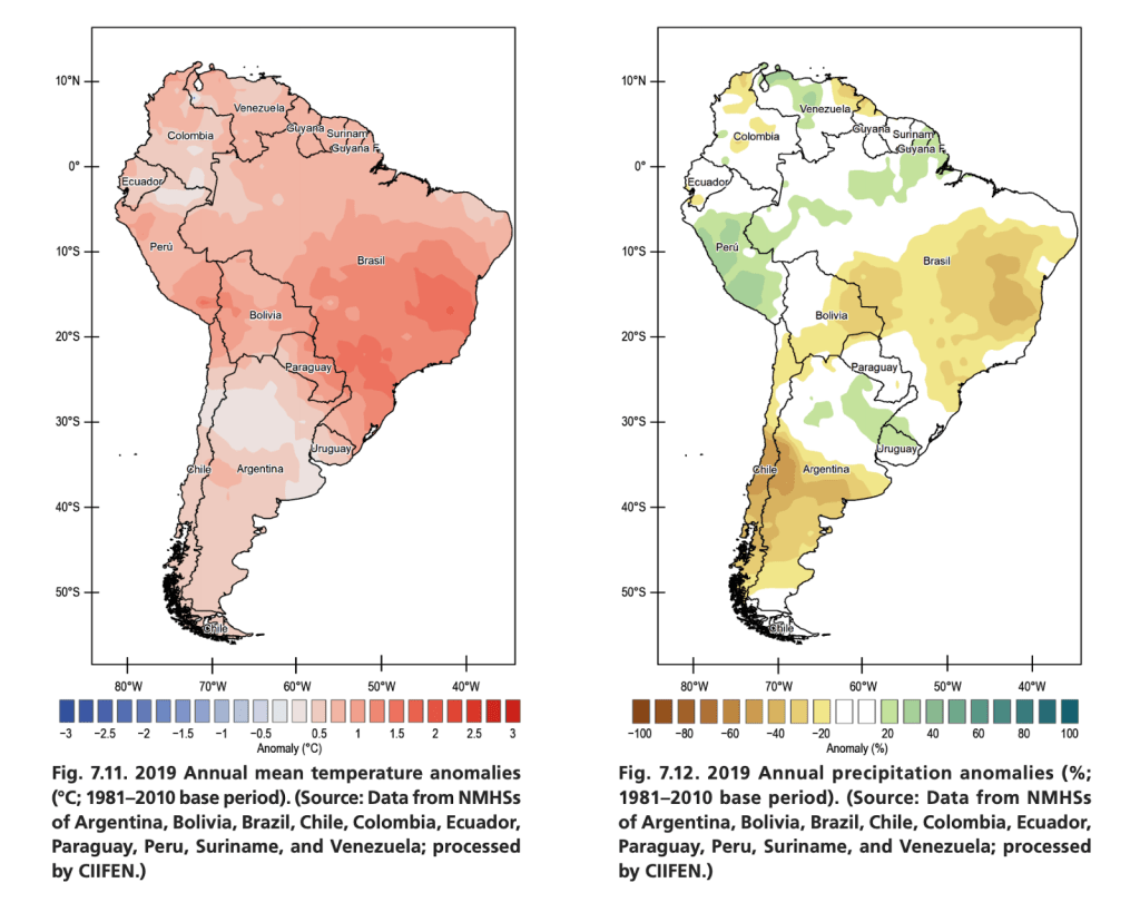 - Sudamérica también fue testigo de varios récords y eventos meteorológicos significativos a lo largo y ancho de la región. Analizando a todo el subcontinente, el 2019 fue el segundo año más cálido en la historia, con una anomalía de temperatura de 0,69 ºC por sobre la media del periodo 1981-2010.