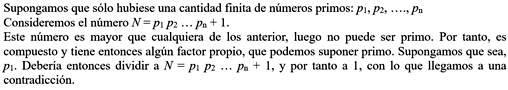 Teorema (Euclides, Elementos, Libro IX, Proposición 60) Los números primos son más que cualquier cantidad dada de ellos.