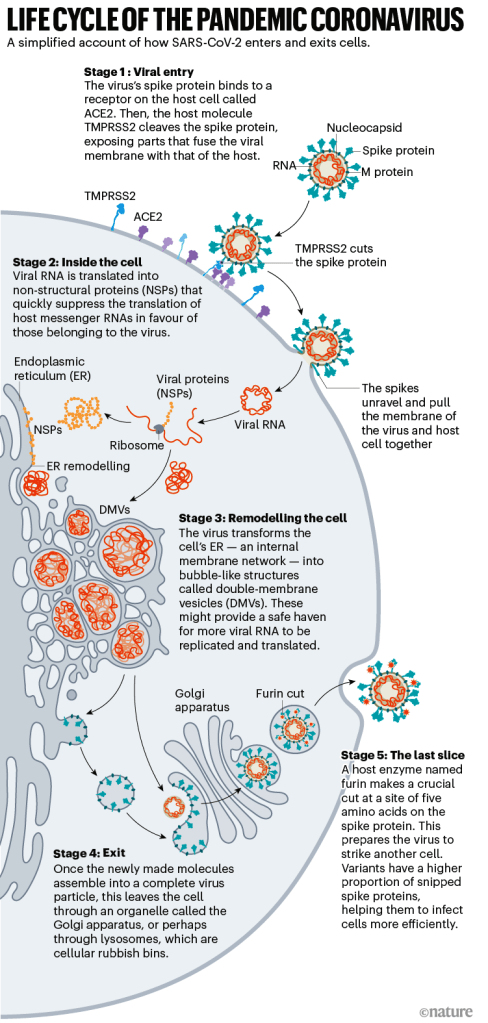 Lo que ha surgido de 19 meses de trabajo, respaldado por décadas de investigación sobre el coronavirus, es un relato paso a paso de cómo el SARS-CoV-2 invade las células humanas. Los científicos han descubierto adaptaciones clave que ayudan al virus a adherirse a las células humanas con una fuerza sorprendente, y luego esconderse una vez dentro. Más tarde, cuando abandona las células, el SARS-CoV-2 ejecuta un paso de procesamiento crucial para preparar sus partículas para infectar aún más células humanas. Estas son algunas de las herramientas que han permitido que el virus se propague tan rápidamente y se cobra millones de vidas. «Por eso es tan difícil de controlar», dice Wendy Barclay, viróloga del Imperial College de Londres.