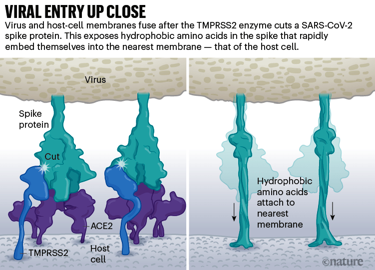 El SARS-CoV-2 se diferencia del SARS-CoV porque utiliza eficientemente TMPRSS2, una enzima que se encuentra en grandes cantidades en el exterior de las células respiratorias. Primero, TMPRSS2 corta un sitio en la subunidad S2 del pico. Ese corte expone una serie de aminoácidos hidrófobos que se entierran rápidamente en la membrana más cercana, la de la célula huésped. A continuación, la espiga extendida se vuelve a doblar sobre sí misma, como una cremallera, obligando a las membranas viral y celular a fusionarse.