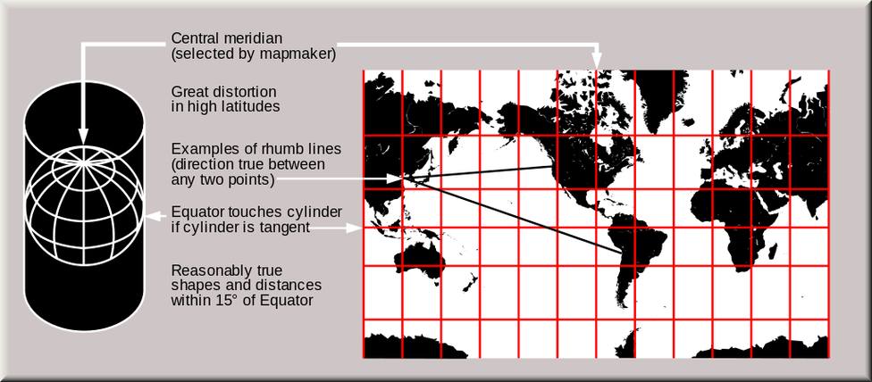 La característica importante de esta proyección consiste en que el sistema de meridianos y paralelos se transforma en un sistema de coordenadas del tipo cartesiano, líneas rectas que se cortan perpendicularmente. Los meridianos son líneas rectas paralelas entre sí dispuestas verticalmente a la misma distancia unos de otros y los paralelos rectas rectas paralelas entre sí dispuestas horizontalmente, pero cuyas distancias aumentan al acercarnos a los polos. Por lo cual, la proyección de Mercator, es un tipo de proyección cilíndrica, que mantiene paralelos al eje terrestre y el cilindro, permite representar toda la superficie terrestre.