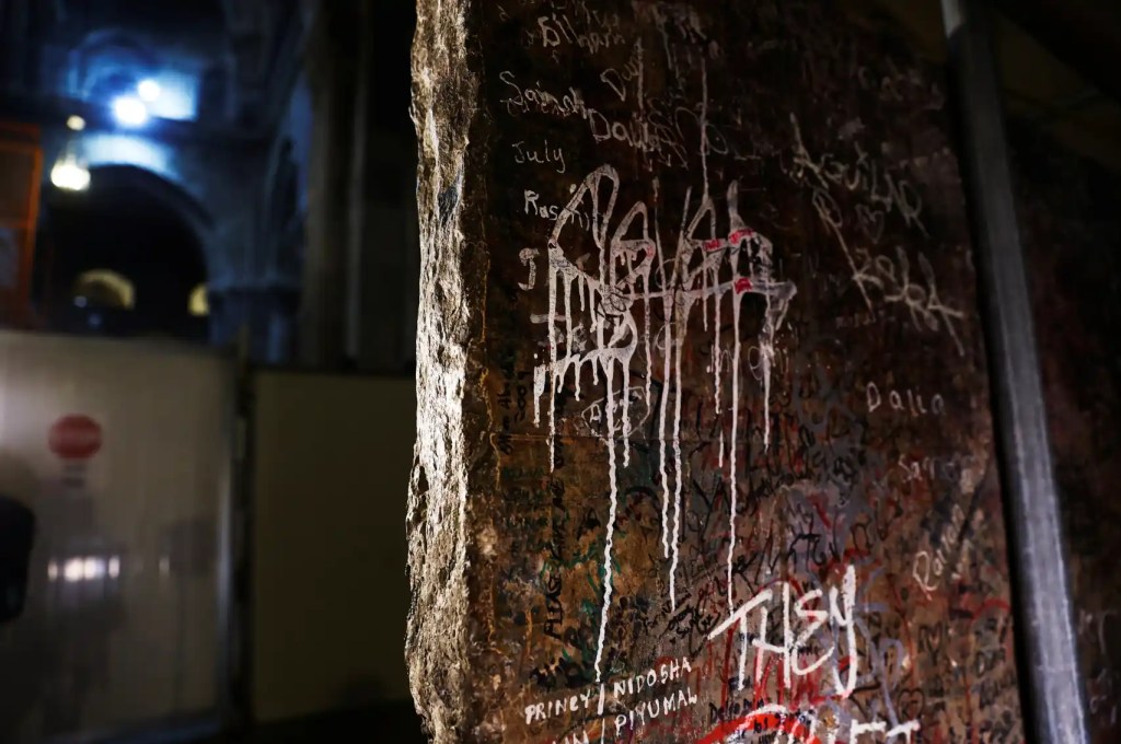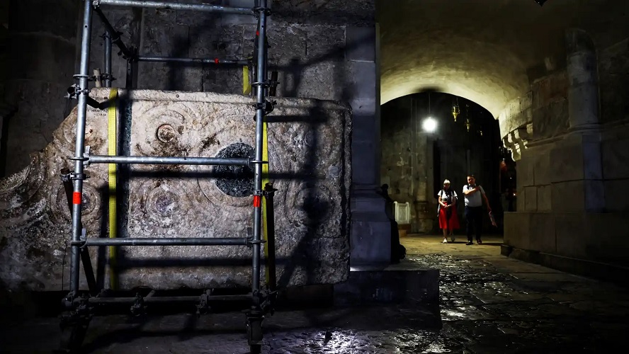 Una losa de piedra de 2,5 metros de largo por 1,5m de ancho, apoyada contra la pared de un corredor oscuro de la iglesia del Santo Sepulcro de Jerusalén, se había convertido en una suerte de libro de visitas de los peregrinos que se internan en el lugar más sagrado de la cristiandad. Con rotuladores y típex han dejado escritos sus nombres en ese recoveco de la basílica erigida supuestamente sobre la tumba de Jesús.