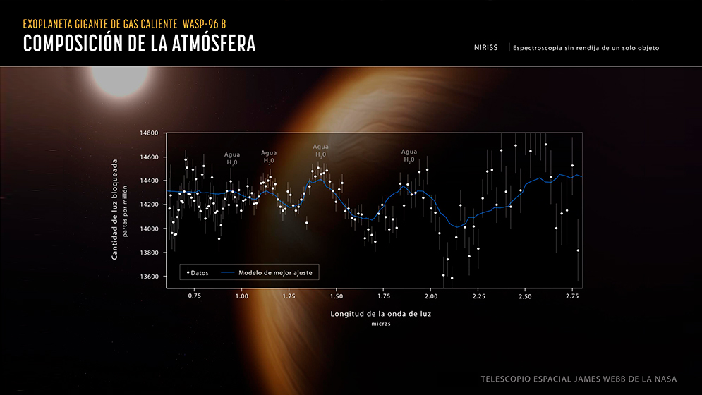 El telescopio de la NASA, de la Agencia Espacial Europea (ESA, por sus siglas en inglés) y la Agencia Espacial Canadiense (CSA, por sus siglas en inglés) también reveló el espectro y los rasgos de la atmósfera de un planeta descubierto en 2014 llamado «WASP-96b». «Un gigante con una masa de casi la mitad de Júpiter pero con unos calurosos 538°C de temperatura, ubicado a unos 1150 años-luz de la Tierra y girando alrededor de una estrella parecida a nuestro Sol, cuya luz procesada con el Webb nos dice, entre otros detalles, que hay presencia de agua en su atmósfera. Este planeta es uno de los más de 5000 planetas extrasolares descubiertos a la fecha», explica el investigador del CONICET.