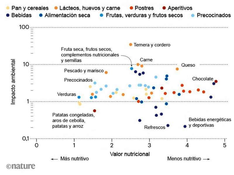 Al comparar el impacto ambiental con la información nutricional, hallaron que los alimentos más sanos eran también los que tenían un menor impacto (veáse el gráfico). Había algunas excepciones destacadas: el valor nutricional, tanto de los frutos secos como del marisco, era bueno, pero su impacto ambiental era relativamente alto.