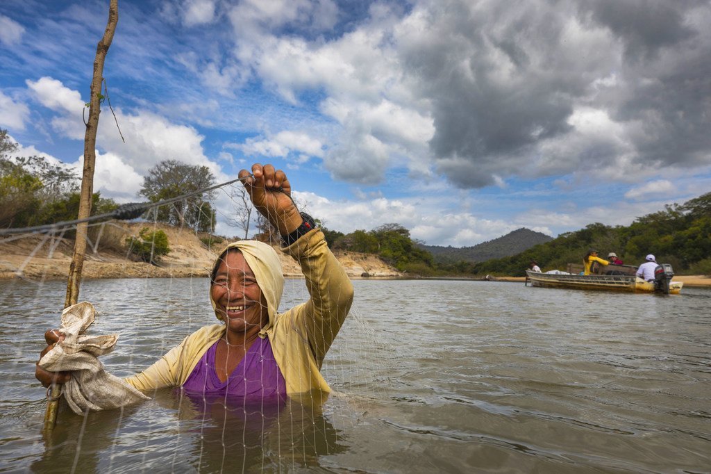 Una mujer indígena utilizando una red para pescar en las aguas del río Rupununi en Guyana.