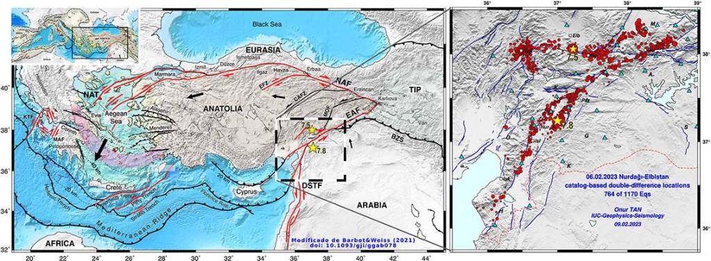 La reciente serie de terremotos en Turquía, compuesta por dos eventos destructivos de magnitudes M7,8 y M7,5, ha sido generada por la activación de varias fallas del sistema de fallas del este de Anatolia (EAF, por sus siglas en inglés), que tiene más de 500 km de longitud y orientación noreste-suroeste. Forma parte del límite entre las placas tectónicas de Arabia (al sureste) y Anatolia (al oeste), que conforman un punto triple de encuentro junto a la Euroasiática (al norte).