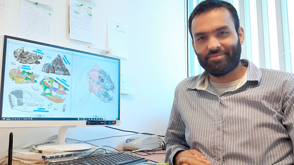 Dado el pequeño tamaño y la fragilidad de los fósiles de Manidens, no era posible aislar mecánicamente muchos de sus huesos, por lo que debieron digitalizarlos para su estudio. «El uso de tomografías computadas sirve para obtener imágenes en forma de secciones o ‘cortes’ de cualquier objeto en estudio. Las partes más densas absorben más radiación y se ven más claras, lo que permite diferenciar distintos componentes del objeto (en este caso, restos fósiles) sin dañarlo. En Alemania, aplicamos una técnica de micro-tomografías que nos permitió obtener cientos de imágenes en forma de cortes o secciones. Luego, con un software pudimos seleccionar y separar cada uno de los huesos que estaban en articulación o solapados, modelarlos digitalmente y reconstruir el cráneo en tres dimensiones. Allí nos dimos cuenta de que teníamos más del 80% del cráneo de esta especie», detalla el investigador.