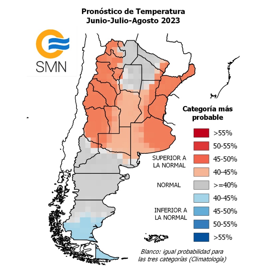 Durante este invierno hay una mayor probabilidad de que se registren, en promedio, temperaturas superiores a lo normales en el NOA, Cuyo, Litoral y el este de Buenos Aires, y valores normales o superiores a lo normales en Córdoba, el oeste de Santa Fe, oeste de Buenos Aires y La Pampa.