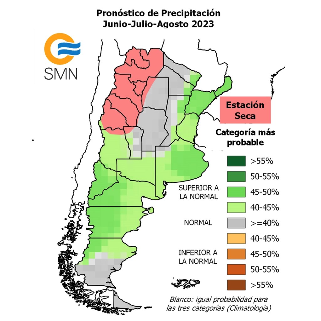 En el oeste del NOA y norte de Cuyo no se suministra pronóstico por ser Estación Seca, es decir, un periodo donde suele haber lluvias escasas.