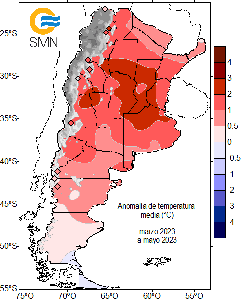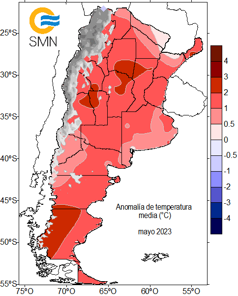 Mayo 2023 fue más cálido que lo normal en gran parte del país. En algunas provincias las temperaturas estuvieron hasta 1 y 2 °C por encima del promedio para el mes. Se destacó una masa de aire templado, y luego más cálido y húmedo, que se estableció a mitad de mes en la franja centro y norte, clave para que el mes finalizara con esos valores de anomalía.