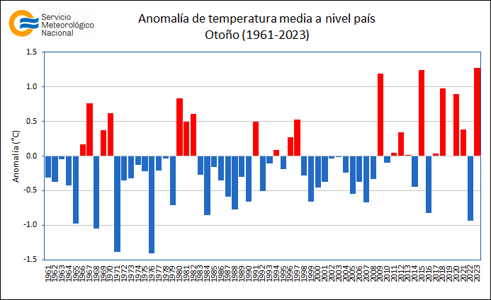 Este otoño fue el más cálido a nivel nacional, junto con los otoños de los años 2015 y 2009: el periodo marzo-abril-mayo 2023 tuvo una temperatura promedio 1,27 °C por encima de lo normal para el periodo 1961-2023.