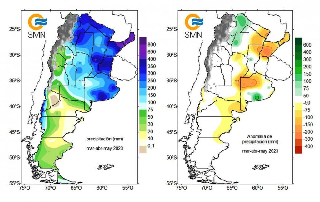 A pesar de las abundantes lluvias de mayo, el otoño finalizó con lluvias entre 100 y 200 mm por debajo del promedio para la época en sectores de la región pampeana y el Litoral. Sólo se presentaron algunos excesos locales en el NOA y el sur de la provincia de Buenos Aires.