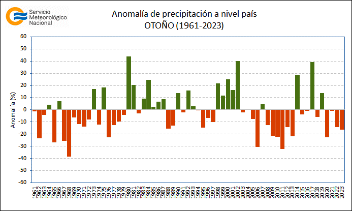 Por otro lado, este otoño fue un 16,2% más seco que lo normal en la Argentina, ubicándose entre los 12 otoños más secos del periodo 1961-2023.
