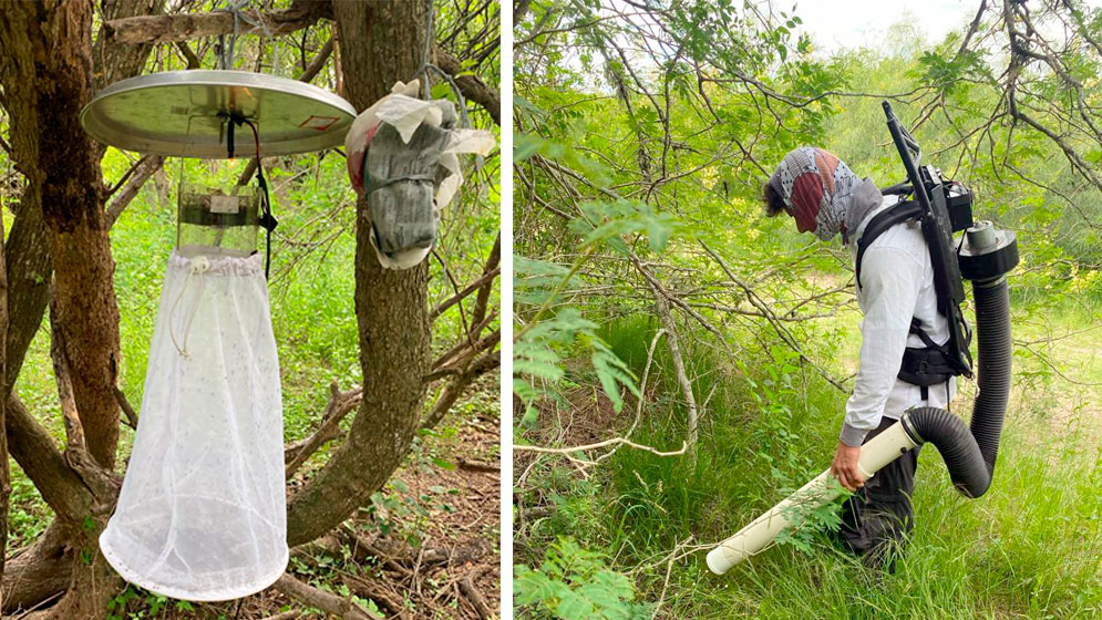 Der: aspirado de mosquitos adultos mediante aspirador mecánico de mochila.