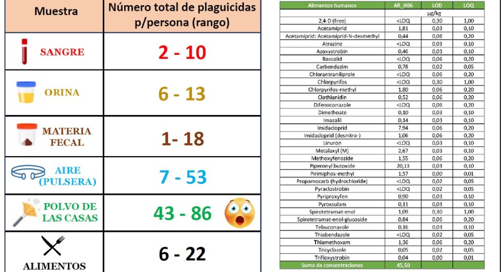«Este proyecto no puede determinar el riesgo para la salud, pero los datos son alarmantes. Si la gente no los conoce, no puede tomar medidas para mitigar los riesgos. Me refiero especialmente al polvo en las casas, que registró uno de los valores más altos, ya que indica que las casas cerca de los campos donde se fumiga concentran más agroquímicos que otras. Son como trampas de sedimentos de pesticidas», advierte De Francesco, detallando que, según los resultados, mientras se detectaron entre dos y ocho pesticidas en sangre, en las casas hubo entre 40 y 60.